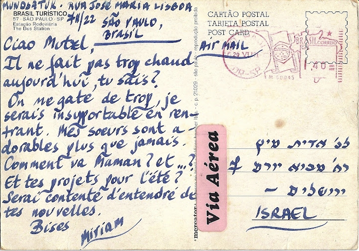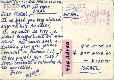 So, after reading (and translating) it to me, she was thinking out loud whether it was written by someone she knew. Sure, São Paulo has a population of several million people, but then again, the number of people who might have written a postcard to Israel in the 70s (and in French to boot) is obviously quite a minuscule percentage of this population.