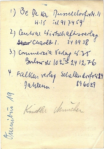 Right, so we have three different things, basically - three different handwriting styles, and three different writing instruments, anyway. In a dark blue pen there's a list of four places and their phone numbers; the word verlag, which according to Wikipedia means 'publisher', recurs a few times (maybe we have a beginning author, trying to find someone to publish his manuscript?), and in items 1 and 3 there is also something that looks like a time (4.15 and 4.35, respectively - maybe meeting a representative of the publisher?). Unfortunately, I couldn't find any of those names on Google. On the left, in a lighter blue pen and a slightly more pointy and elegant handwriting, it says Omnibus 19, which is of course bus #19. And at the bottom, in pencil, something that looks like somebody's name (it's hard for me to read this handwriting).