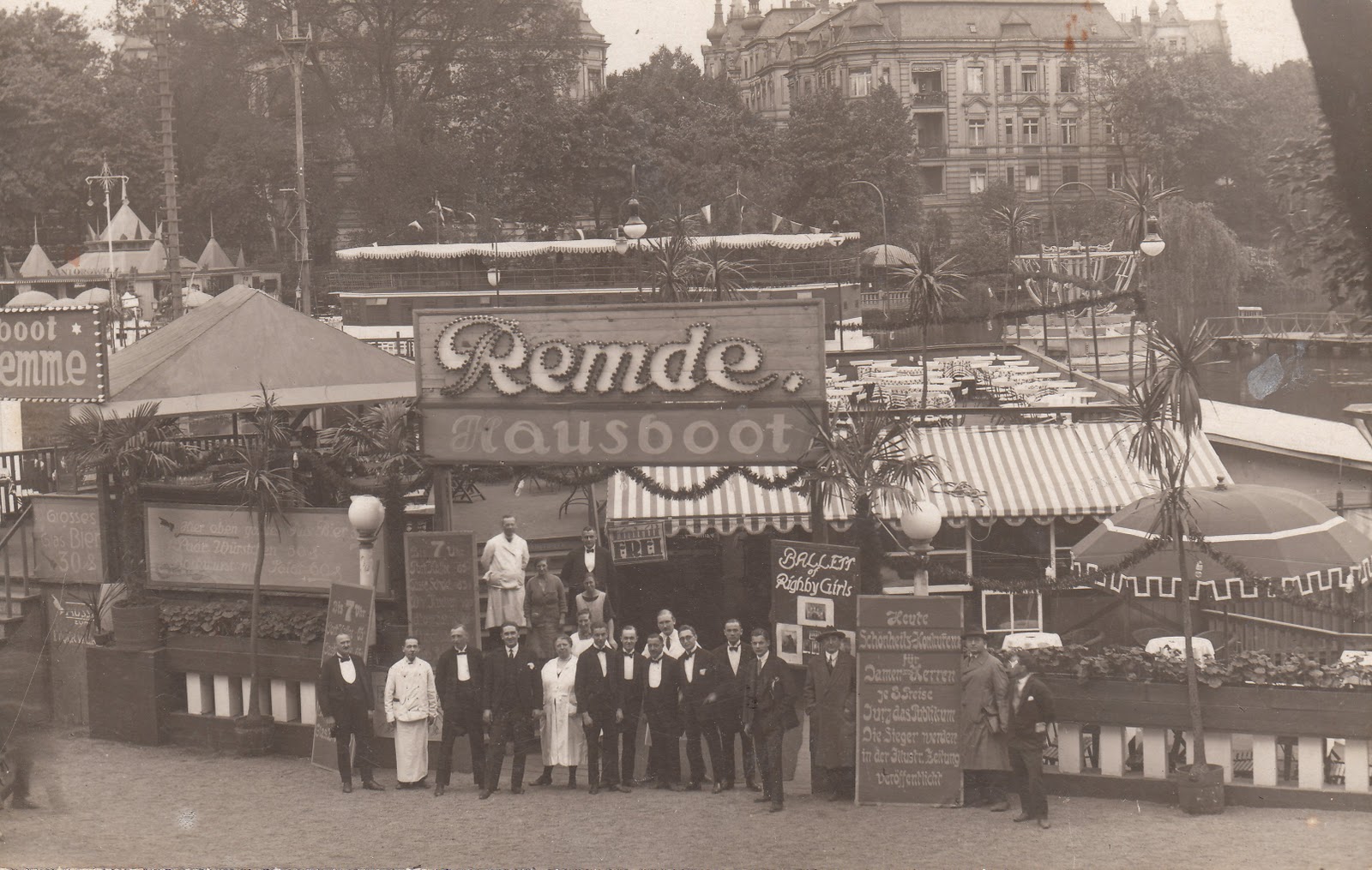 And one last picture: Remde and staff next to the Hausboot club, opened in 1922. There are some interesting signs that I can't really read (and the one I did manage to read, advertising a show by 'Ballett of Righby Girls', was no use at all - Google has never heard of them), and if you look carefully at the middle right you can see a sort of round stage on the water which is probably part of the lunapark (amusement park) where the club was. I kinda like this picture in general: