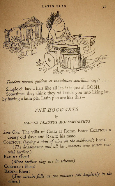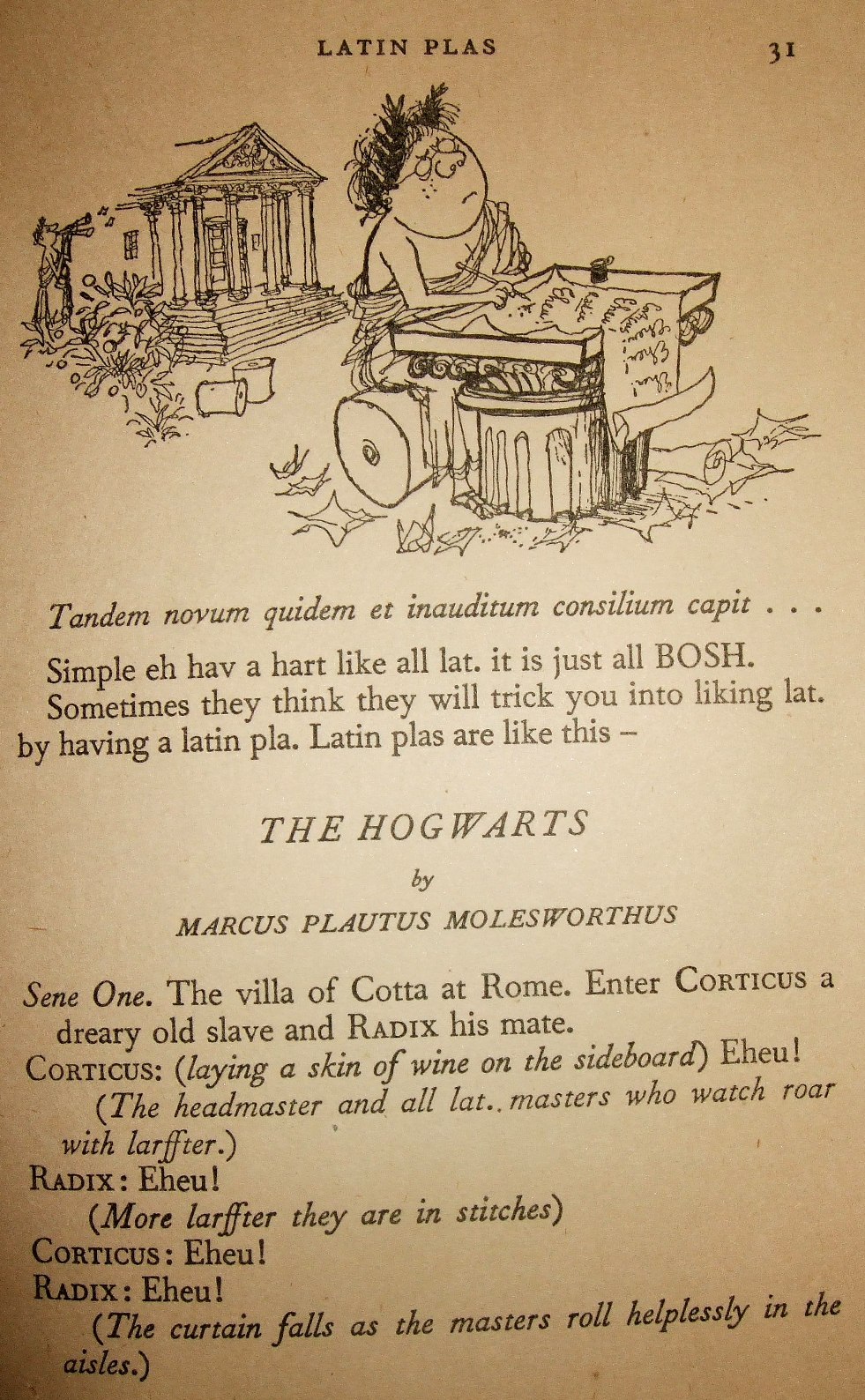 Here's one example of the text, which I would like to dedicate to everyone who saw 'British boarding-school' and thought of Harry Potter (and/or to anyone who happens to be studying Latin):