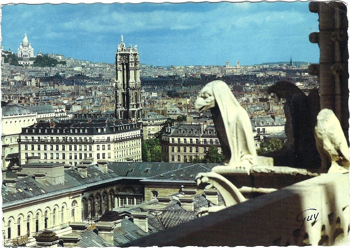 הגרוטסקות האלה שייכות כמובן לקתדרלת נוטרדאם-דה-פארי - ואני אומרת 'כמובן' לא כי אני כזו מומחית לפאריס אלא כי הפרטים מופיעים בצד האחורי של הגלויה. אבל תכל'ס, נוטרדאם (והגרוטסקות שלה) באמת נורא מפורסמת, ויכול להיות שהייתי מנחשת בעצמי. אגב, אם כבר אני מספקת פרטים לפי הכיתוב בצד האחורי, ברקע אפשר לראות את גבעת מונמארטר ובזיליקת הסקרה קר, את מגדל סן ז'אק, ואת כנסיית סן-ונסן-דה-פול. סה מניפיק!
